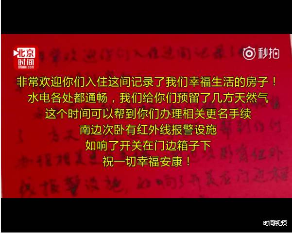 “非常欢迎你们入住这间记录了我们幸福生活的房子!”温州一房主因替朋友借款担保而承担债务,房子被司法网拍。 10月31日,温州一套公寓以390万的价格成交。司法网拍原本不稀奇,但这房子有故事:房主因替朋友借款担保而承担债务,离开前不仅把房子打扫干净,保持水电燃畅通,还留下个温馨的小纸条。当买主得知房子背后故事,感动之余表示“买得值”。 ”水电各处都通畅,我们给你们预留了几方天然气,这个时间可以帮到你们办理相关更名手续,南边次卧有红外线报警设施,如响了开关在门边箱子下。祝一切幸福安康!“